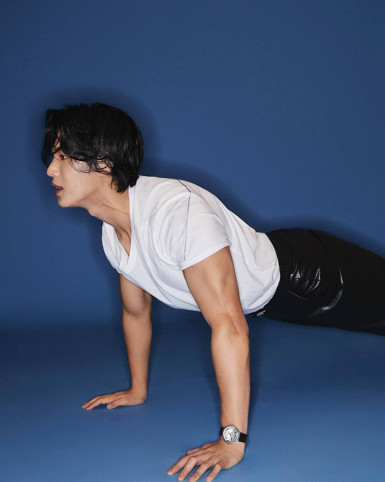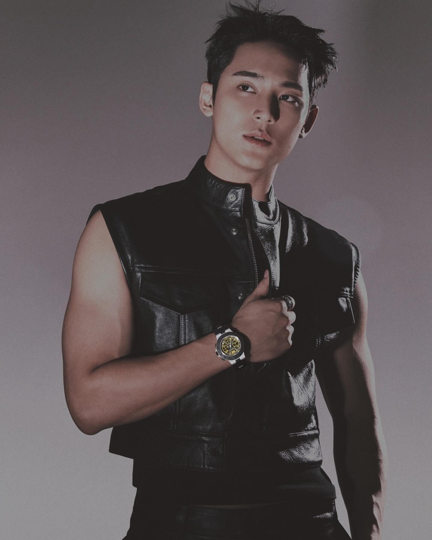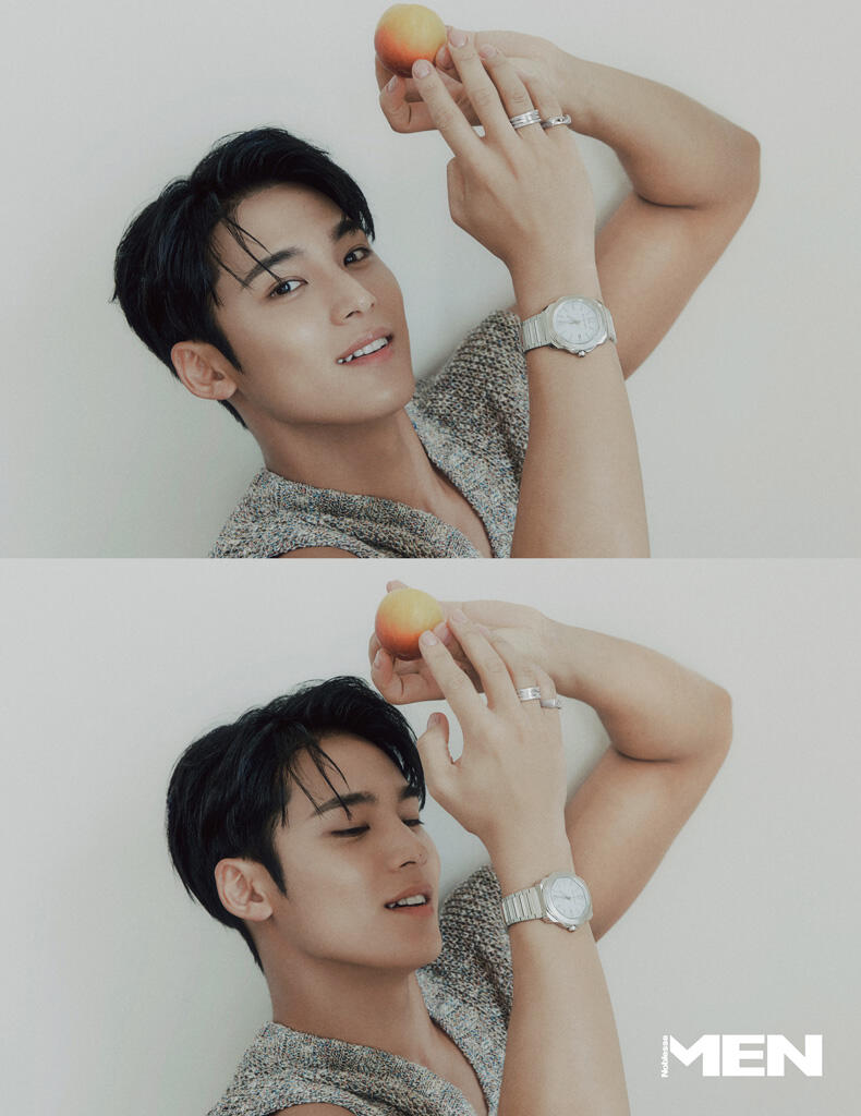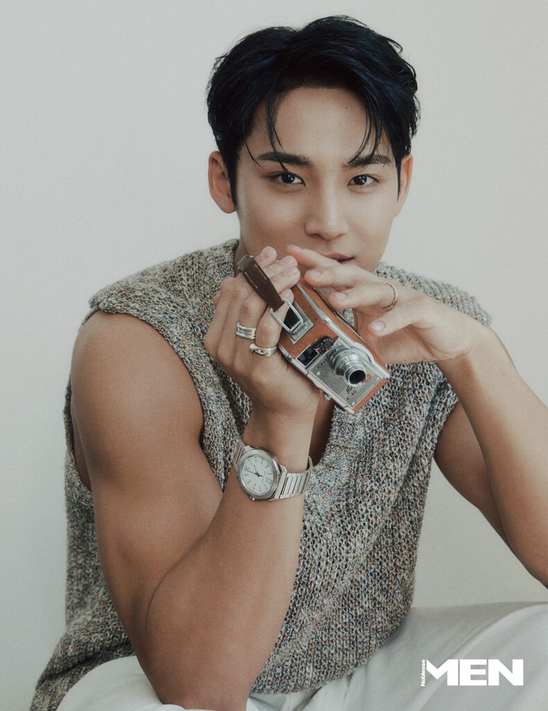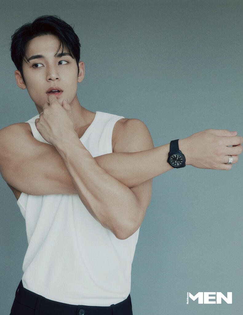 Working out/exercising is the happiest hobby for me. Playing, to simply put. Someone can play games, watch movies, or read books. Rather than those, I do activities that make me sweat. From soccer, basketball, badminton, golf, to biking– I like outdoor sports. Exercising is my hobby, and you can say that it’s a form of a pastime.I can often see you wearing a jacket without innerwear or a sleeveless top which reveals your arms, but I’m curious if this is professional styling or a charm that Mingyu wants other people to notice.
