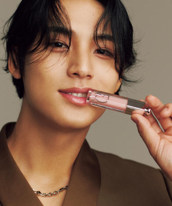 When I heard we were going to wear this gloss before we filmed, I thought it was going to be one with color, but I didn’t realize it was a very natural color. It lets me show my charms, so I think I can wear it like a lip balm that I regularly wear. My lips get dry easily, and this product is very moisturizing, so I really enjoy the feeling of application! Because we have been practicing for the dome tour recently, I rarely get to wear such formal clothing. But today I wore a navy blue suit with the thought of this shoot energizing me as I came to work. And I’ve always really liked this type of styling (regarding his brown suit styling).Do you normally do lip care?